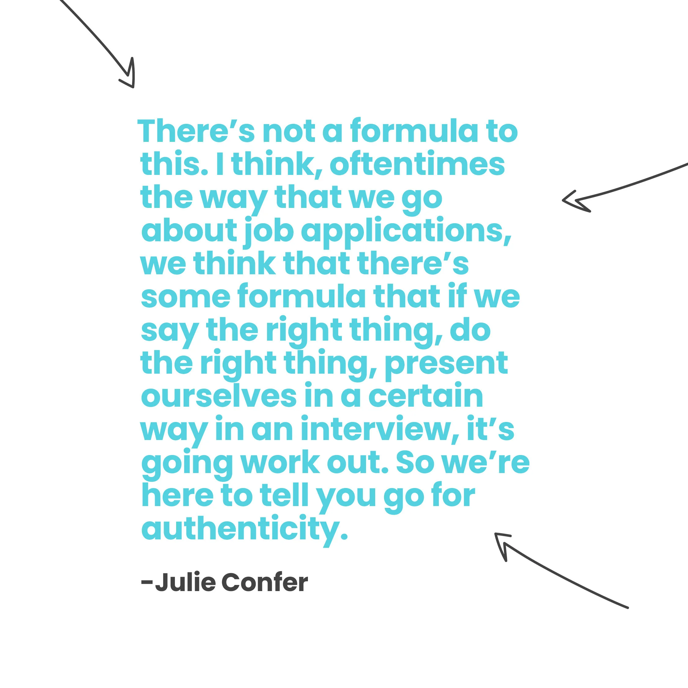 “There's not a formula to this. I think, oftentimes the way that we go about job applications, we think that there's some formula that if we say the right thing, do the right thing, present ourselves in a certain way in an interview, it's gonna work out. So we're here to tell you go for authenticity. I wish someone would have gone back a couple years and just told me to take the pressure off of myself.” -Julie