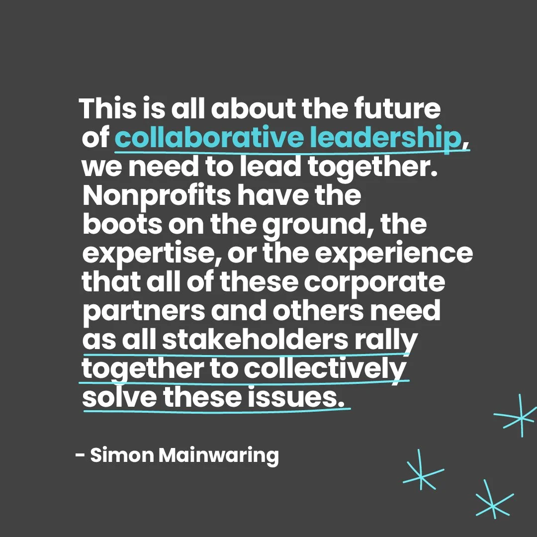 “This is all about the future of collaborative leadership, we need to lead together. Nonprofits have the boots on the ground, the expertise, or the experience that all of these corporate partners and others need as all stakeholders rally together to collectively solve these issues. So you are not less important. But at the same time, the competition has gone through the roof, because every for profit company, or younger social enterprises now talking about the good they're doing.” -Simon