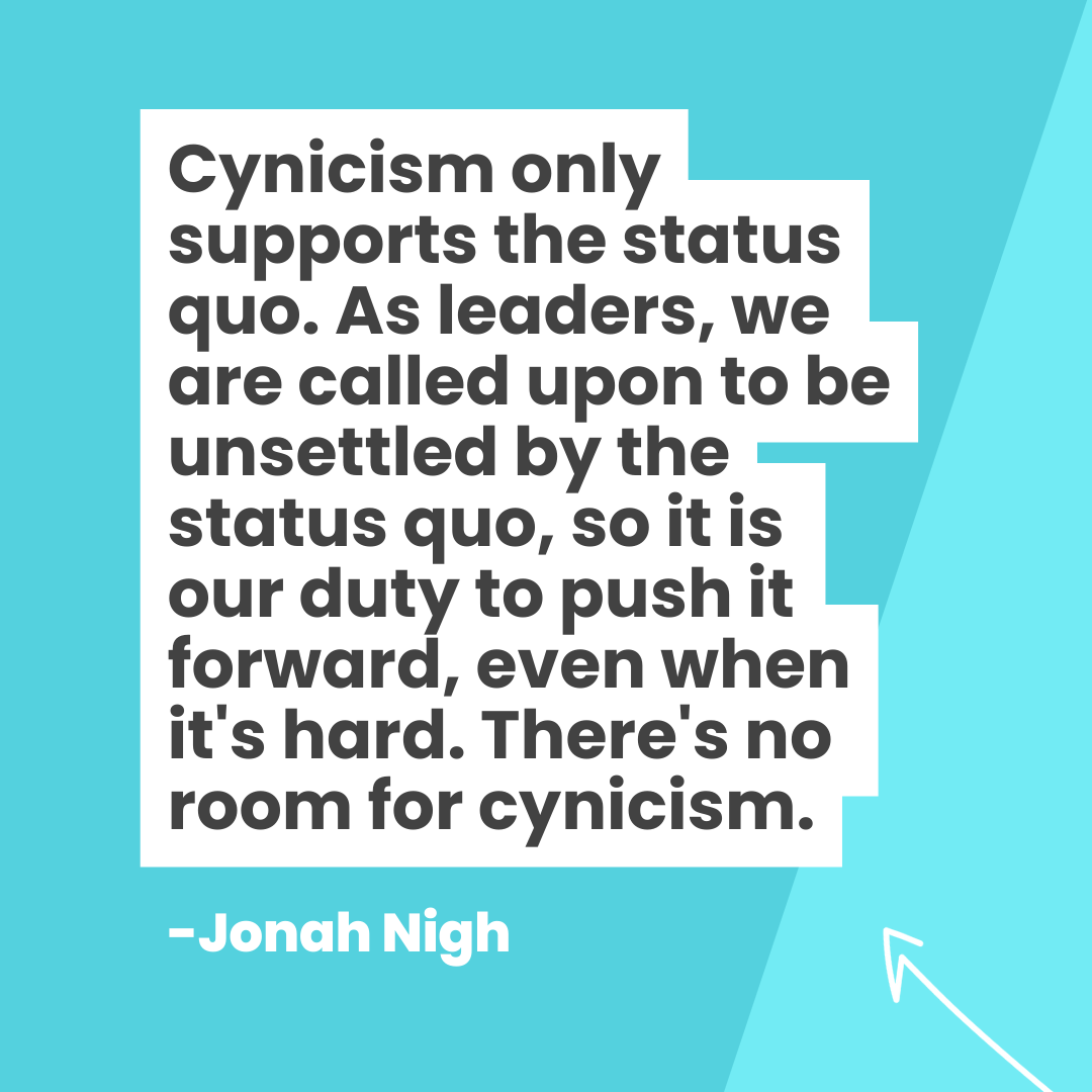 "Cynicism only supports the status quo. So as leaders we are called upon to be unsettled by the status quo." -Jonah